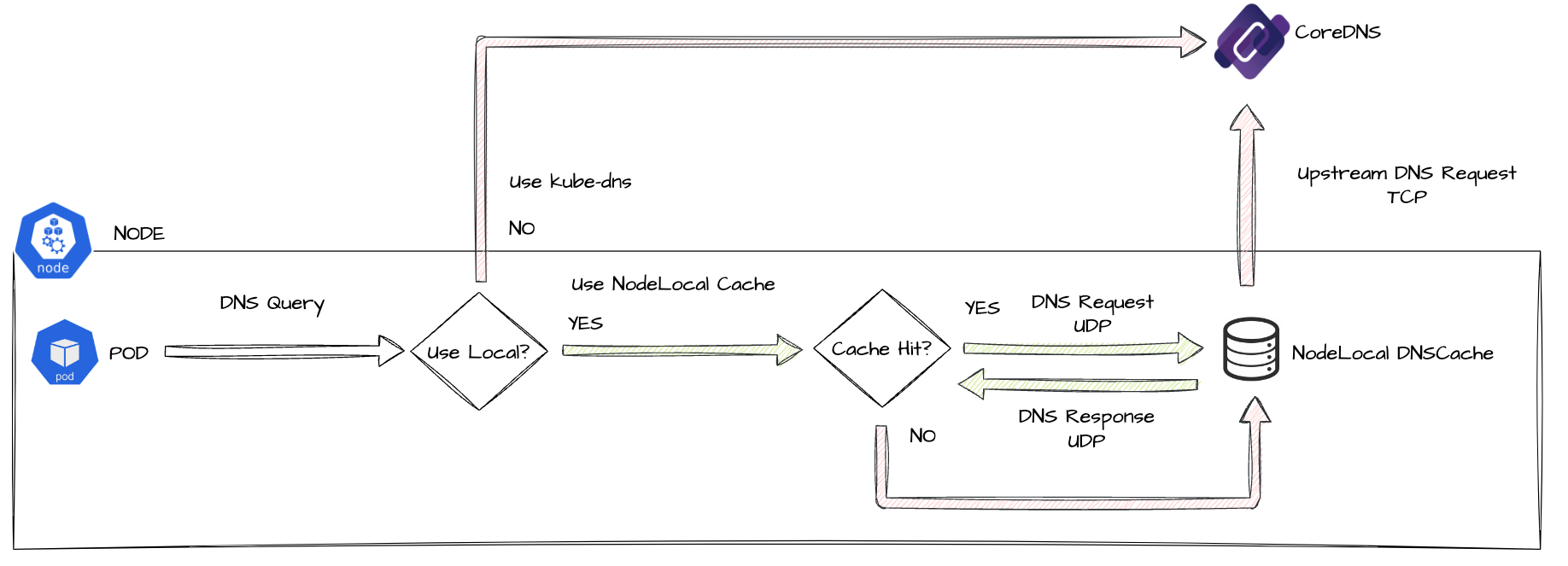 NodeLocal DNSCache는 아래 절차로 역할을 수행합니다.