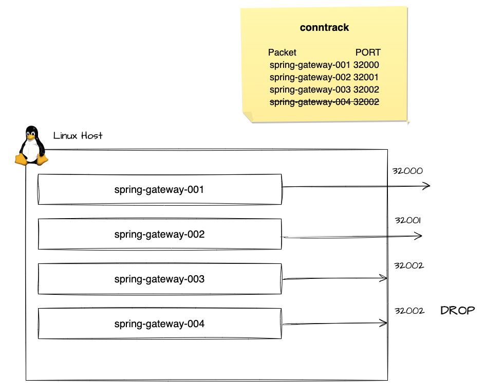 2. 이 Conntrack이 관리하는 테이블은 충분히 Consistency하지 않기 때문에 짧은 시간에 대량의 패킷이 생성되는 경우 Race Condition으로 인해 동시에 동일한 포트 번호를 부여하는 경우가 발생합니다.