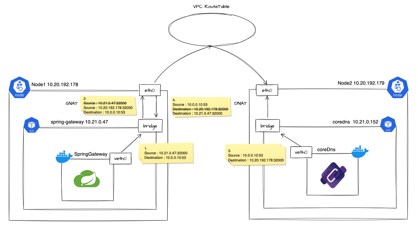 2. CoreDNS Pod는 노드 밖에 있으므로, IPTable의 라우팅 규칙에 따라 kube-dns ClusterIP가 노드 밖의 Pod를 Destination으로 변경합니다.
