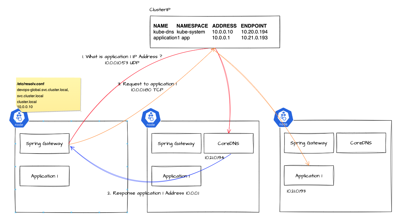 2. Spring Gateway는 Backend로 요청을 라우팅하기 위해 "kube-dns" 주소로 Domain name Resolving을 시도합니다.