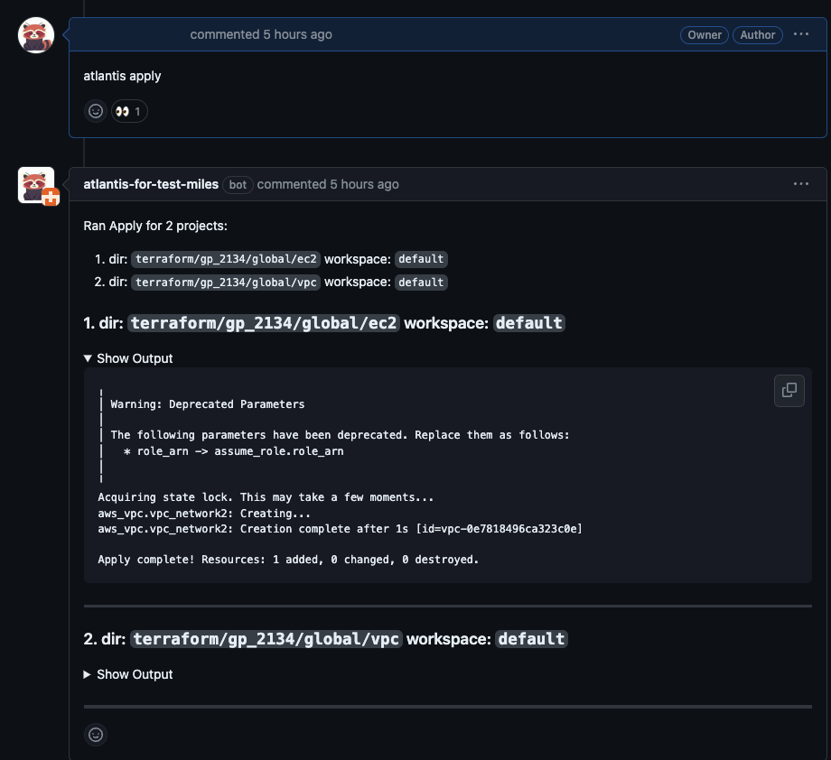 - 사용자는 Plan 내역을 확인하고 배포를 결정하면, Comment에 "atlantis apply"를 입력합니다.