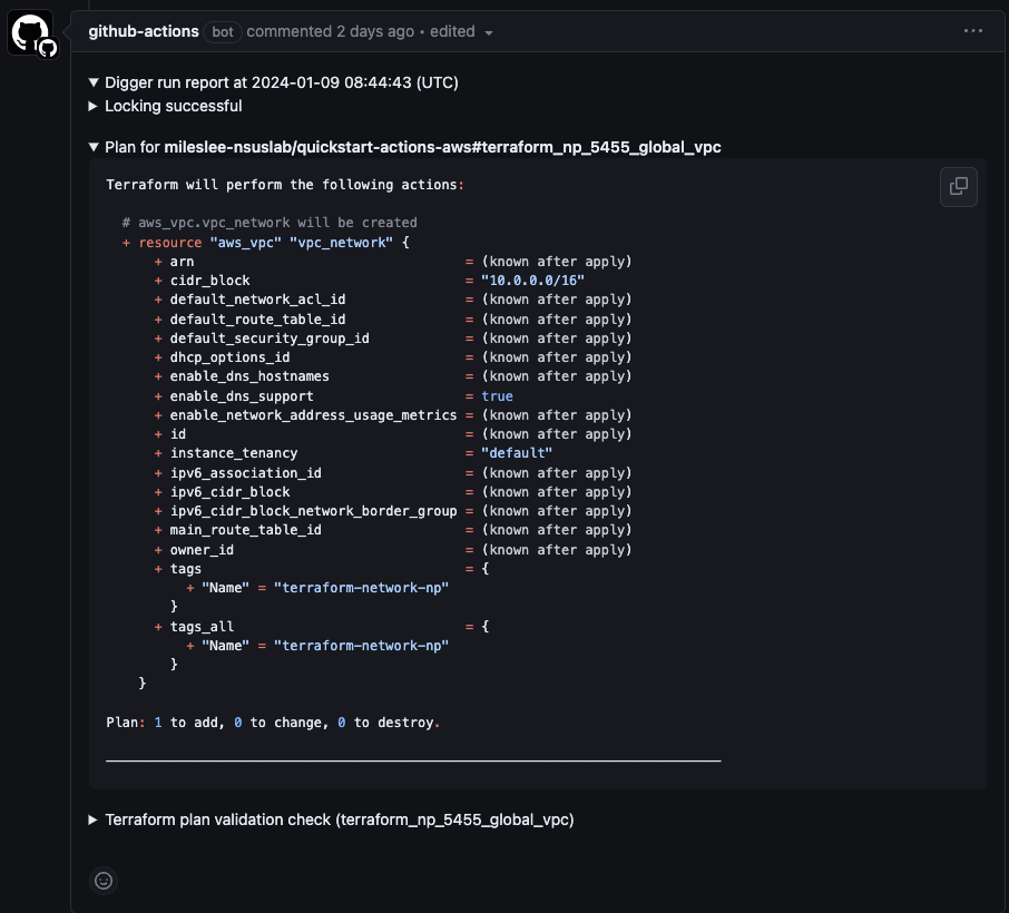 Digger가 Terraform Plan 작업을 수행한 후 Comment로 생성하는 Plan 내역은 다음과 같습니다.