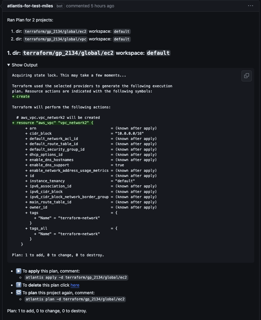 Atlantis가 Terraform Plan 작업을 수행한 후 Comment로 생성하는 Plan 내역은 다음과 같습니다.