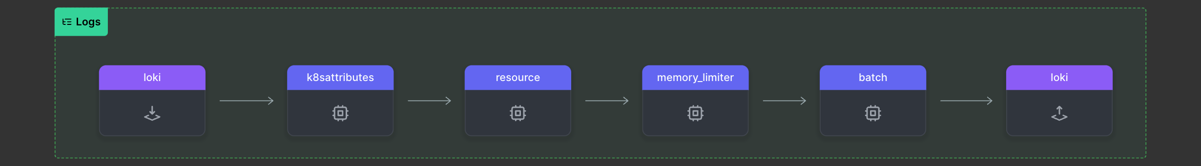 filelog, k8s_events Receiver에서 Log 데이터를 수집해k8sattributes, resource, memory_limiter, batch순으로 가공한 뒤, Loki Exporter를 사용해 Loki backend로 전송합니다.