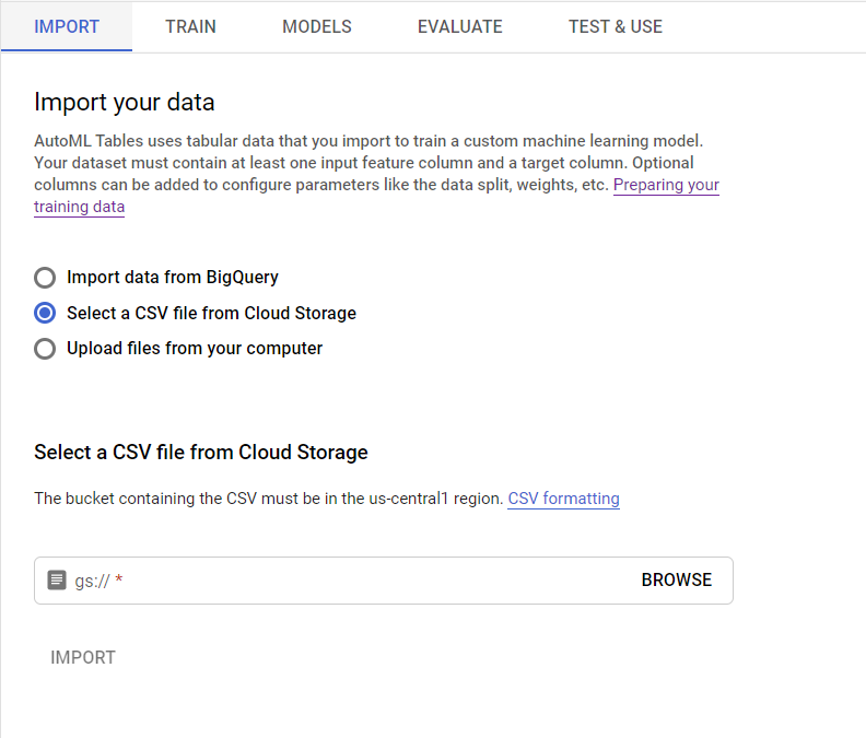 Auto ML Tables는 bigQuery, Google Cloud Storage, Web console의 3가지 방법으로 위의 정형 데이터를 업로드할 수 있다.