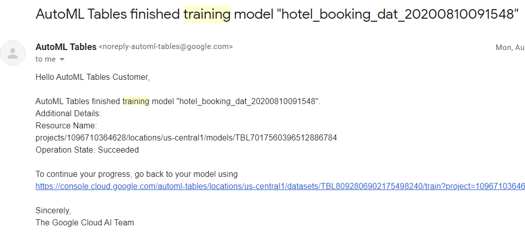 학습이 완료되어 모델이 완성되면 GCP에 등록된 Email address로 알림이 온다.