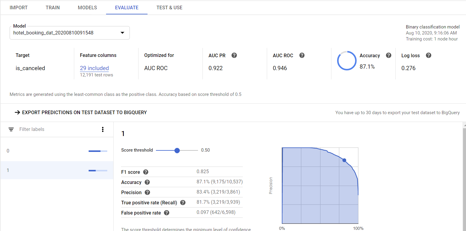 AutoML Tables 에서는 Model을 평가할 수 있는 다양한 정보를 제공한다.