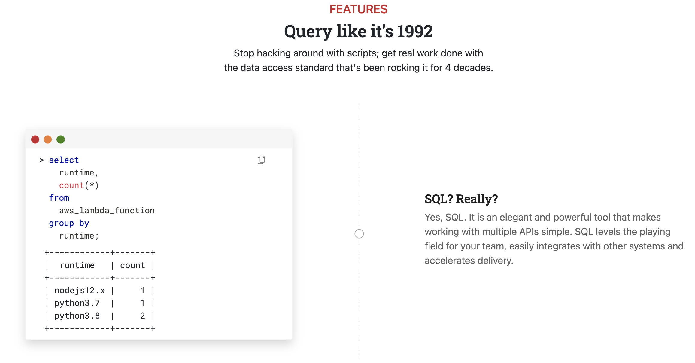 흔히 사용하는 SQL문을 지원하며(더 정확히는 Postgresql 기반의 SQL) 별다른 DB를 설치하지 않아도 되기 때문에 사용이 간편하고 빠릅니다.