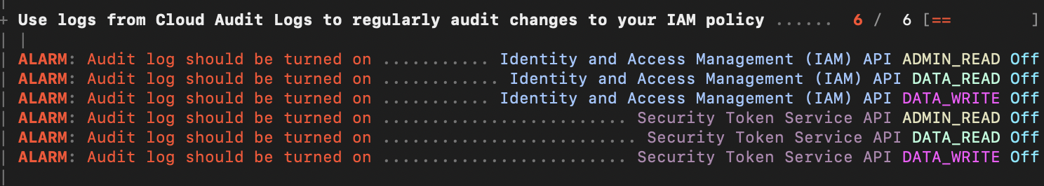 아래와 같이 IAM과 Security token service API에 대한 Audigt log의 ADMIN_READ, DATA_READ, DATA_WRITE 유형 중 켜지지 않은 것이 있으면 Alarm을 출력합니다.