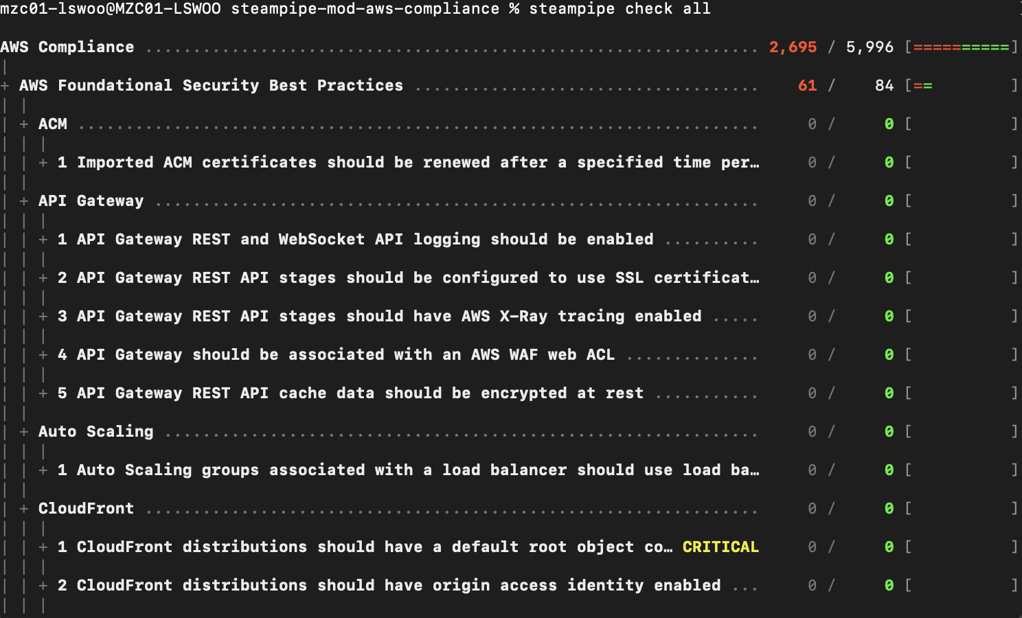 이렇게 AWS compliance를 준수했는지 확인할 수 있는 쿼리들을 한 번에 실행한 후, 준수 결과를 확인할 수 있습니다.