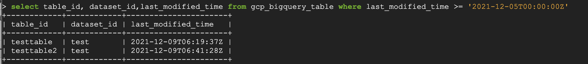 - GCP 프로젝트에 존재하는 bigquery 테이블 중 last_modified_time 값이 2021년 12월 5일 이후인 것의 table id, dataset id, last modified time을 조회
