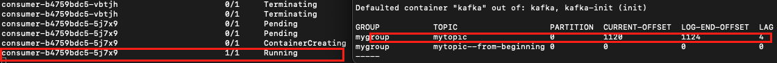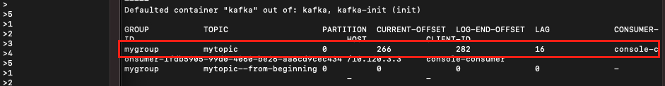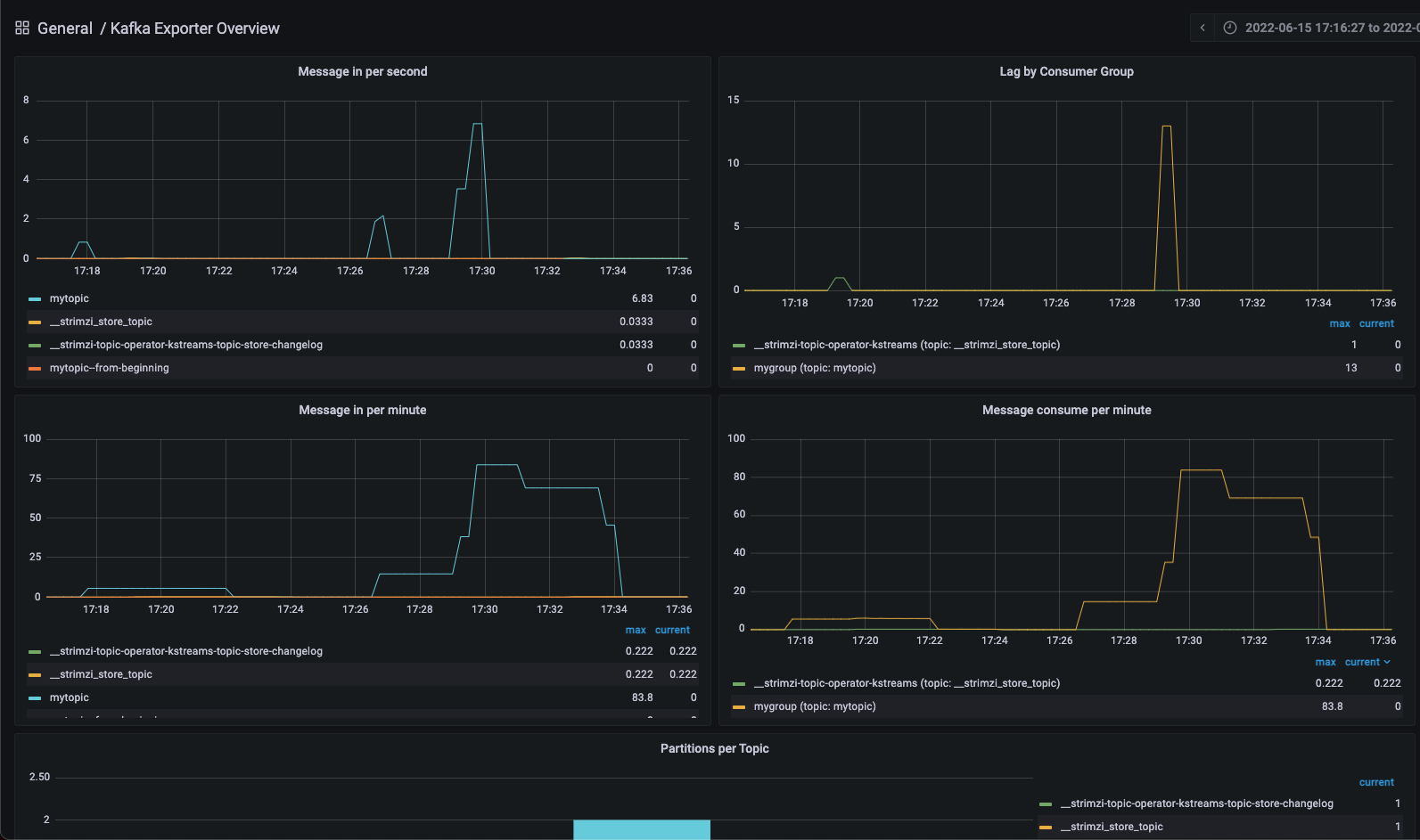 실제로 Message를 발행하거나 Lag를 늘려보는 것으로 Dashboard의 그래프가 달라지는 것을 실시간으로 확인할 수 있습니다.