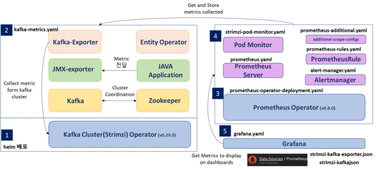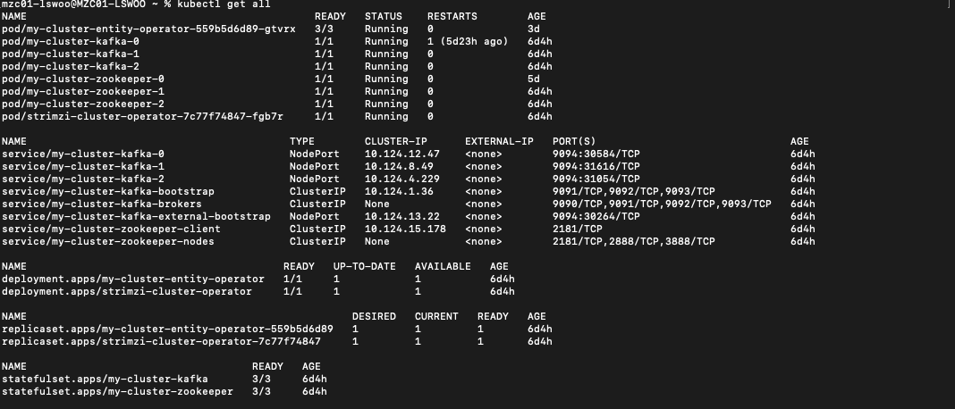 Statefulset은 각각 Kafka Cluster와 Zookeeper Cluster를, Deployment는 각각 Entity Operator와 Cluster Operator를 의미합니다.