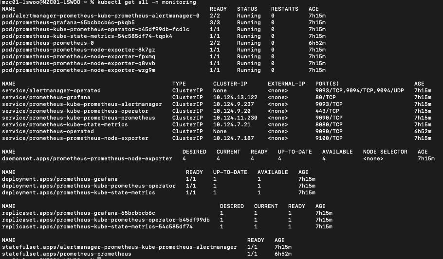 설치를 성공적으로 완료하고 나면, 아래와 같이 2개의 Statefulsets, 2개의 Deployments로 이루어진 오브젝트들이 생성된 것을 볼 수 있습니다.