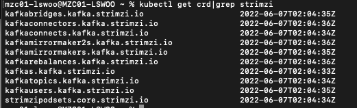 그 외에 Strimzi Operator가 지원하는 CRD 목록은 다음과 같습니다. 아래와 같이 kafkas라는 이름으로 kafka cluster를 배포 및 관리할 수 있으며, kafka bridge, connect, topic 등의 요소들도 CR로 관리할 수 있음을 확인할 수 있습니다.
