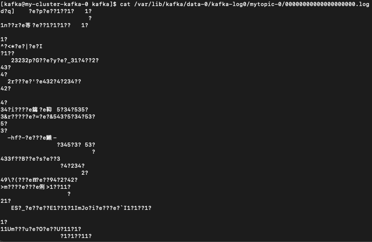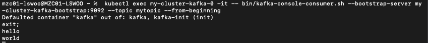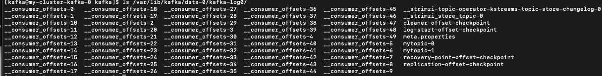 Kafka broker의 설정을 확인해보겠습니다. 아래 명령어를 입력해 Kafka broker의 설정을 확인합니다. 아래와 같이 id 0,1,2로 명명된 my-cluster-kafka-0,1,2 Broker들의 정보를 볼 수 있습니다.