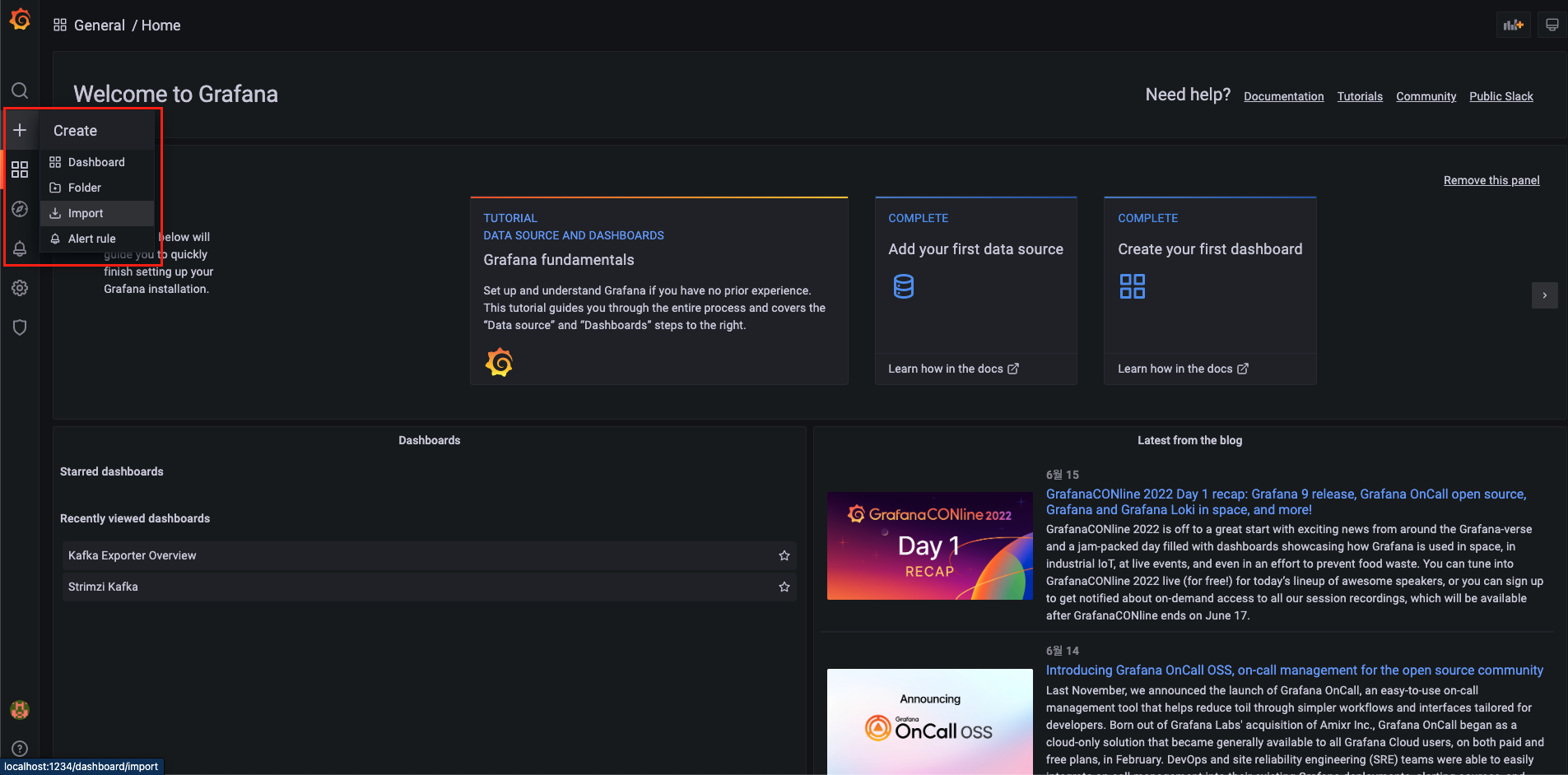 Grafana UI에 접속했다면 우측의 Create -> Import 버튼을 클릭해 Dashboard를 import할 수 있는 페이지로 진입합니다.