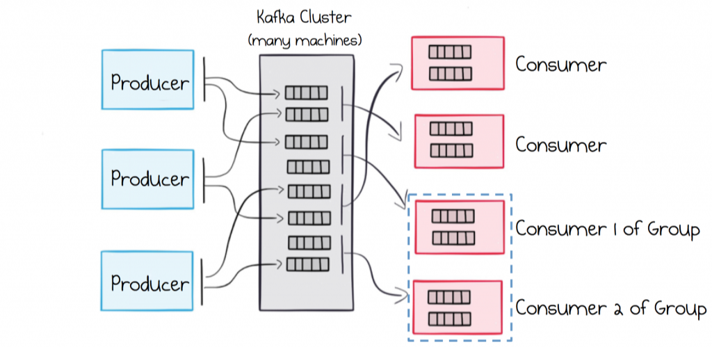 즉 Apache Kafka는 Event streaming Platform으로써 여러 곳에서 들어오고 나가는 Event들을 한 곳에서 처리할 수 있도록 묶어주는 Event Bus의 역할을 할 수 있기 때문에 아키텍쳐를 간결하게 만들 수 있습니다.