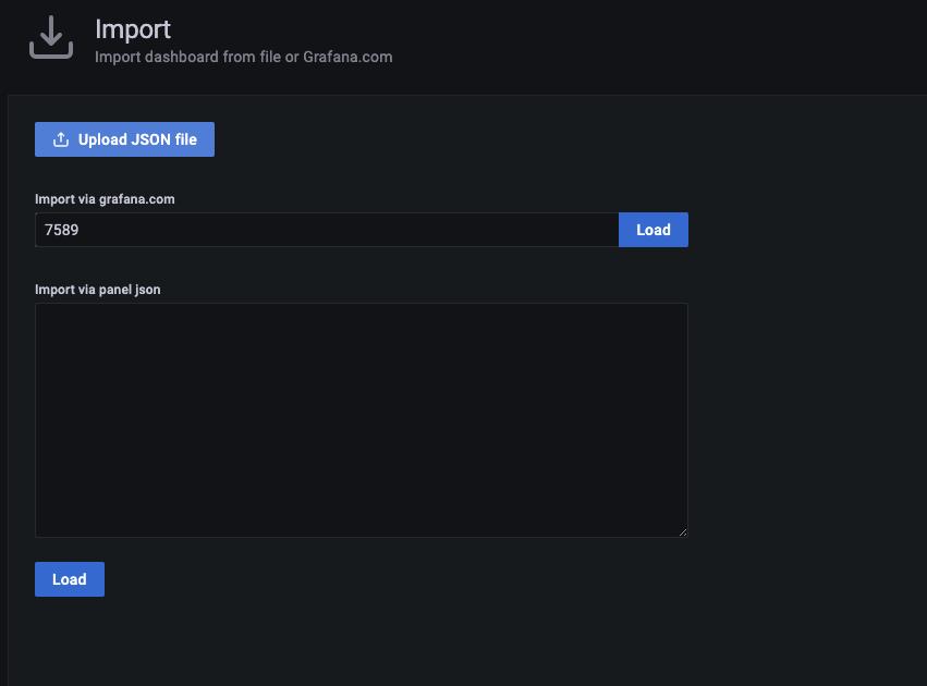 Grafana는 생성된 Custom dashboard를 ID 번호로 import할 수 있는 기능이 있습니다. Kafka exporter Dashboard의 ID인 "7589"를 적고 Load 버튼을 클릭합니다.