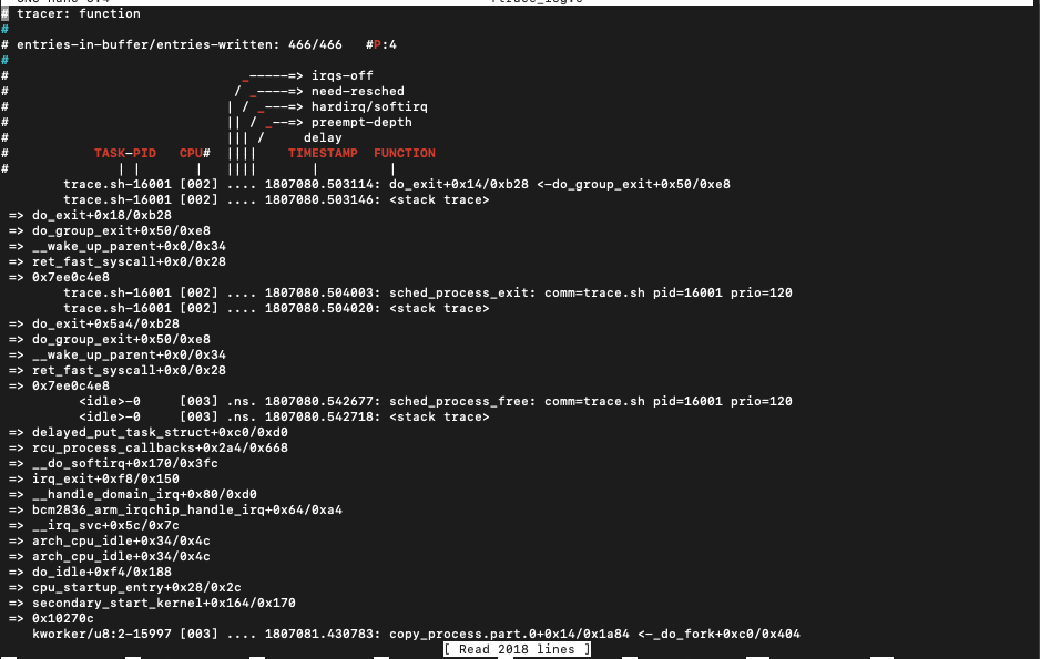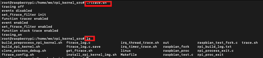 위 스크립트를 sh 파일로 저장한 뒤 실행하면, "/sys/kernel/debug/tracing/trace" 경로에 추적한 함수들을 담은 로그 파일이 생성됩니다.