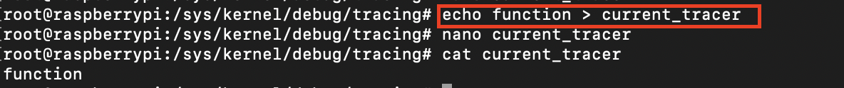 아래와 같이 "current_tracer" 파일에 tracer 이름 값을 넣으면 특정한 tracer를 사용해 함수를 추적하도록 설정할 수 있습니다.
