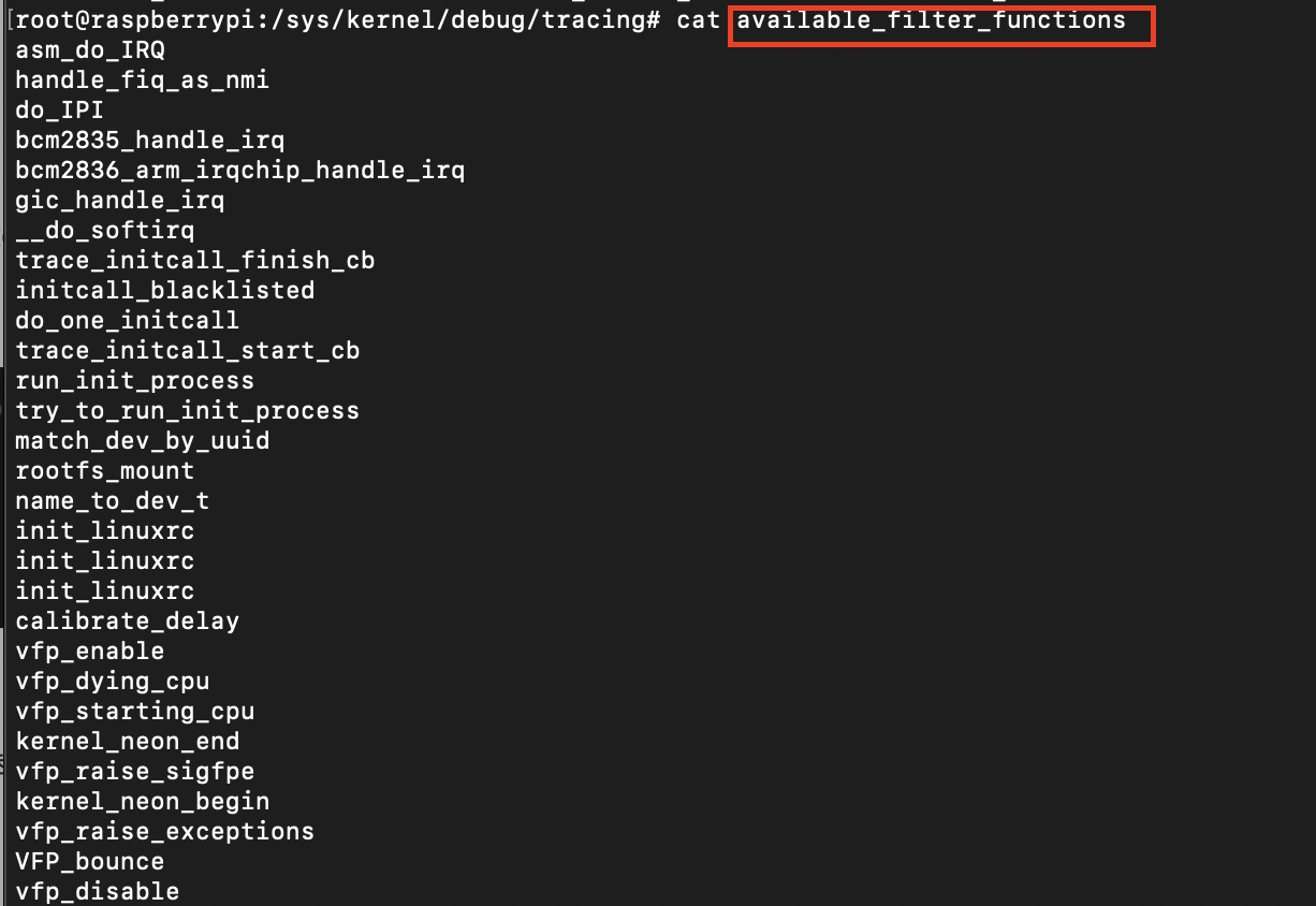ftrace가 모든 함수들을 추적할 수 있는 것은 아닙니다. 추적할 수 있는 함수들의 목록은 "available_filter_functions"에서 확인할 수 있습니다.